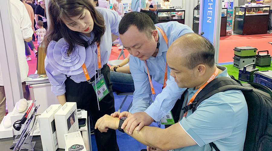 必一运动科技全自研算法检测血压的智能手表Gamma Watch 在展会期间也大放异彩,不少东南亚国家商会的代表都对Gamma Watch内置的气泵血压检测技术表示出相当大的兴趣,现场体验后对于其测量的准确度、佩戴的舒适度表示认可。