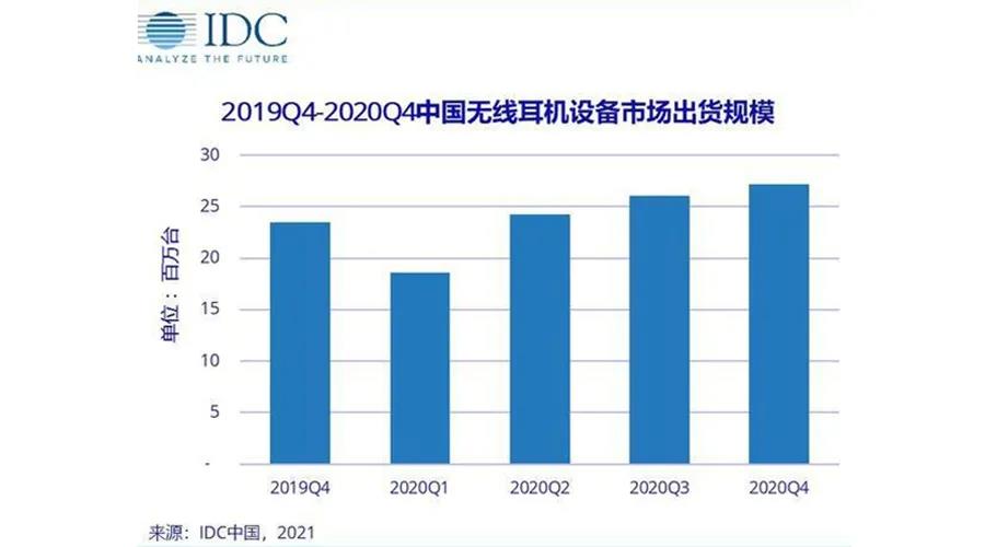 据IDC《中国无线耳机设备市场季度跟踪报告,2020年第四季度》显示,2020年中国无线耳机市场出货量为9,610万台,同比增长23.5%。其中真无线耳机占比66%,同比增长44.1%。Counterpoint预计2021年全球TWS真无线耳机市场将同比增长33%,达到3.1亿台。